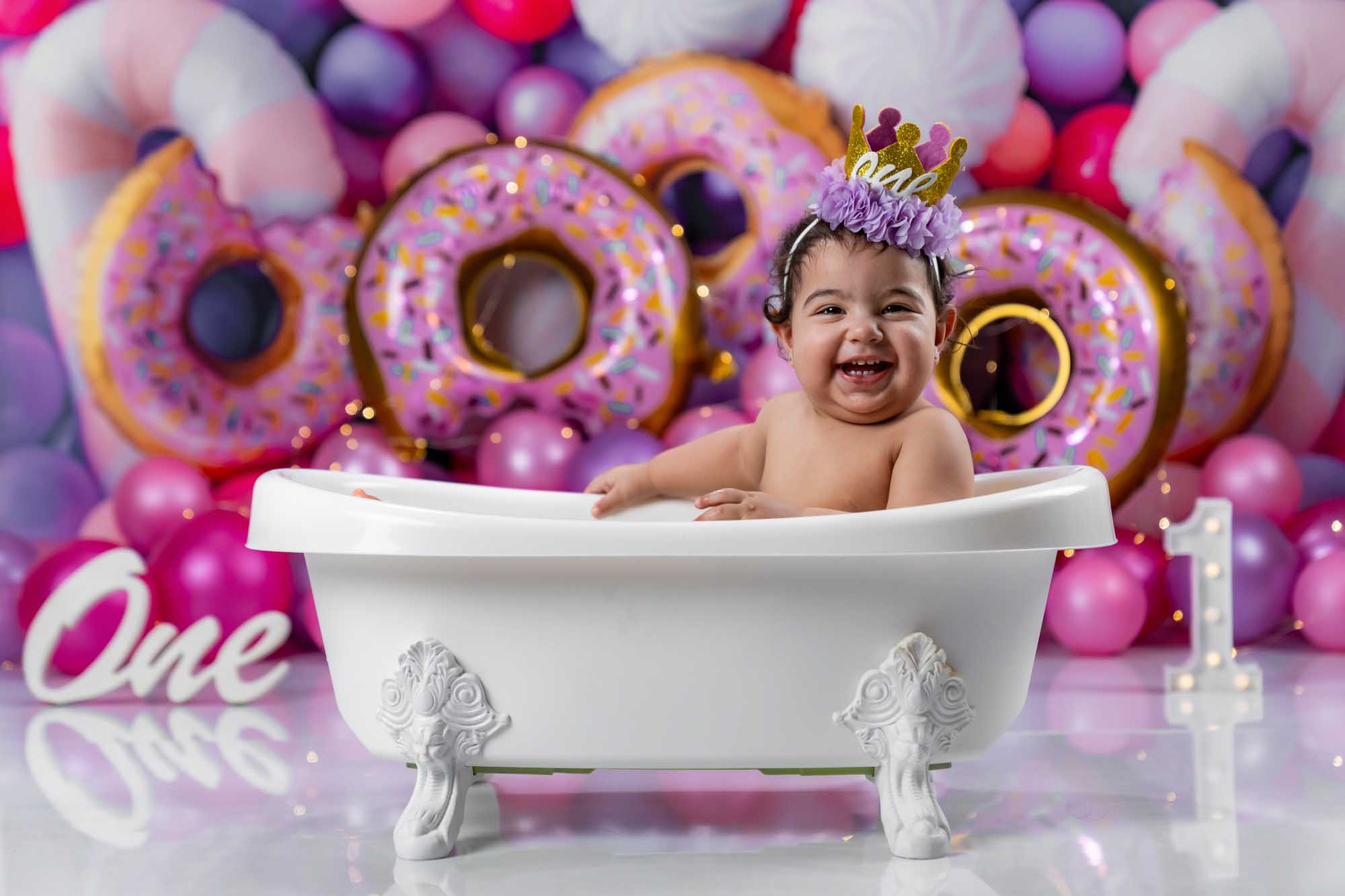 Baby im Badewannen-Cake-Smash-Shooting mit buntem One-Dekor in Wien